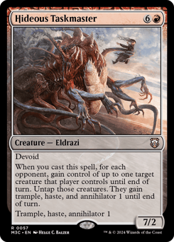 Devoid (This card has no color.) When you cast this spell, for each opponent, gain control of up to one target creature that player controls until end of turn. Untap those creatures. They gain trample, haste, and annihilator 1 until end of turn. Trample, haste, annihilator 1 (Whenever this creature attacks, defending player sacrifices a permanent of their choice.)