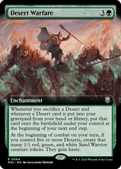 Whenever you sacrifice a Desert and whenever a Desert card is put into your graveyard from your hand or library, put that card onto the battlefield under your control at the beginning of your next end step. At the beginning of combat on your turn, if you control five or more Deserts, create that many 1/1 red, green, and white Sand Warrior creature tokens. They gain haste.