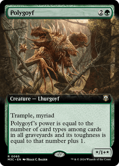 Trample, myriad (Whenever this creature attacks, for each opponent other than defending player, you may create a token copy that's tapped and attacking that player or a planeswalker they control. Exile the tokens at end of combat.) Polygoyf's power is equal to the number of card types among cards in all graveyards and its toughness is equal to that number plus 1.