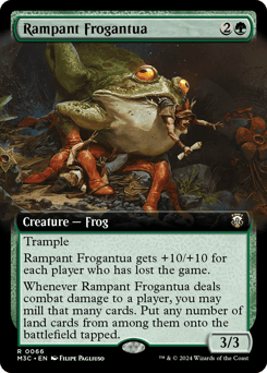 Trample This creature gets +10/+10 for each player who has lost the game. Whenever this creature deals combat damage to a player, you may mill that many cards. Put any number of land cards from among them onto the battlefield tapped.