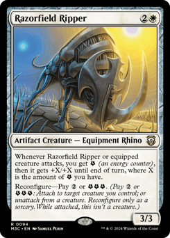 Whenever this creature or equipped creature attacks, you get {E} (an energy counter), then it gets +X/+X until end of turn, where X is the amount of {E} you have. Reconfigure—Pay {2} or {E}{E}{E}. (Pay {2} or {E}{E}{E}: Attach to target creature you control; or unattach from a creature. Reconfigure only as a sorcery. While attached, this isn't a creature.)