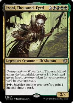 Undergrowth — When Izoni enters, create a 1/1 black and green Insect creature token for each creature card in your graveyard. {B}{G}, Sacrifice another creature: You gain 1 life and draw a card.