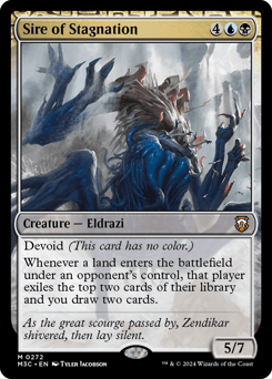 Devoid (This card has no color.) Whenever a land an opponent controls enters, that player exiles the top two cards of their library and you draw two cards.