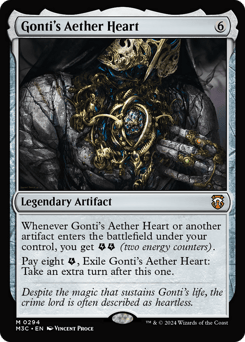 Whenever Gonti's Aether Heart or another artifact you control enters, you get {E}{E} (two energy counters). Pay eight {E}, Exile Gonti's Aether Heart: Take an extra turn after this one.