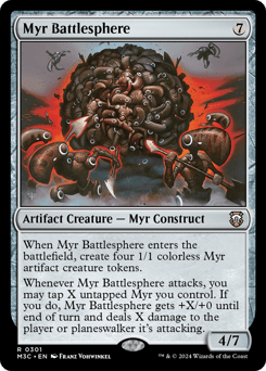 When this creature enters, create four 1/1 colorless Myr artifact creature tokens. Whenever this creature attacks, you may tap X untapped Myr you control. If you do, this creature gets +X/+0 until end of turn and deals X damage to the player or planeswalker it's attacking.