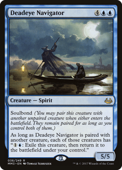 Soulbond (You may pair this creature with another unpaired creature when either enters. They remain paired for as long as you control both of them.) As long as Deadeye Navigator is paired with another creature, each of those creatures has "{1}{U}: Exile this creature, then return it to the battlefield under your control."