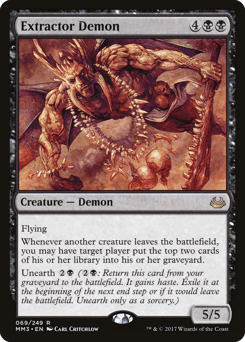 Flying Whenever another creature leaves the battlefield, you may have target player mill two cards. Unearth {2}{B} ({2}{B}: Return this card from your graveyard to the battlefield. It gains haste. Exile it at the beginning of the next end step or if it would leave the battlefield. Unearth only as a sorcery.)