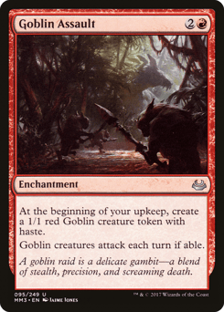 At the beginning of your upkeep, create a 1/1 red Goblin creature token with haste. Goblin creatures attack each combat if able.