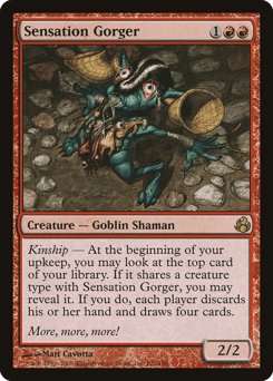 Kinship — At the beginning of your upkeep, you may look at the top card of your library. If it shares a creature type with this creature, you may reveal it. If you do, each opponent discards a card.