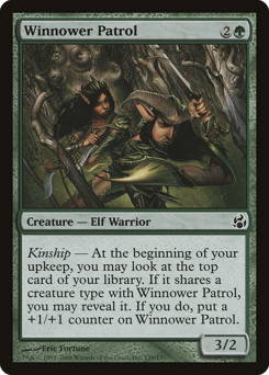 Kinship — At the beginning of your upkeep, you may look at the top card of your library. If it shares a creature type with this creature, you may reveal it. If you do, each creature you control gains flying until end of turn.