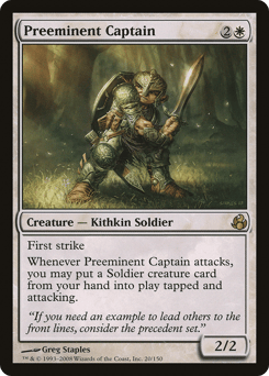 First strike (This creature deals combat damage before creatures without first strike.) Whenever this creature attacks, you may put a Soldier creature card from your hand onto the battlefield tapped and attacking.