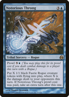 Prowl {5}{U} (You may cast this for its prowl cost if you dealt combat damage to a player this turn with a Rogue.) Create X 1/1 black Faerie Rogue creature tokens with flying, where X is the damage dealt to your opponents this turn. If this spell's prowl cost was paid, take an extra turn after this one.