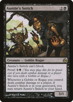 This creature can't block. Prowl {1}{B} (You may cast this for its prowl cost if you dealt combat damage to a player this turn with a Goblin or Rogue.) Whenever a Goblin or Rogue you control deals combat damage to a player, if this card is in your graveyard, you may return this card to your hand.