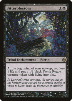 At the beginning of your upkeep, you lose 1 life and create a 1/1 black Faerie Rogue creature token with flying.