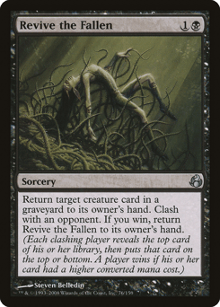 Return target creature card from a graveyard to its owner's hand. Clash with an opponent. If you win, return Revive the Fallen to its owner's hand. (Each clashing player reveals the top card of their library, then puts that card on their choice of the top or bottom. A player wins if their card had a greater mana value.)