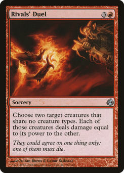 Choose two target creatures that share no creature types. Those creatures fight each other. (Each deals damage equal to its power to the other.)