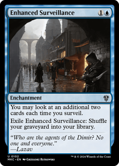 You may look at an additional two cards each time you surveil. Exile this enchantment: Shuffle your graveyard into your library.