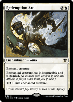 Enchant creature Enchanted creature has indestructible and is goaded. (It attacks each combat if able and attacks a player other than you if able.) {1}{W}: Exile enchanted creature.