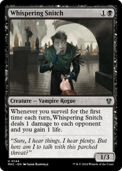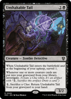 When this creature enters and at the beginning of your upkeep, surveil 1. Whenever one or more creature cards are put into your graveyard from your library, investigate. (Create a Clue token. It's an artifact with "{2}, Sacrifice this token: Draw a card.") {2}, Sacrifice a Clue: Return this card from your graveyard to your hand.