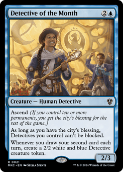 Ascend (If you control ten or more permanents, you get the city's blessing for the rest of the game.) As long as you have the city's blessing, Detectives you control can't be blocked. Whenever you draw your second card each turn, create a 2/2 white and blue Detective creature token.