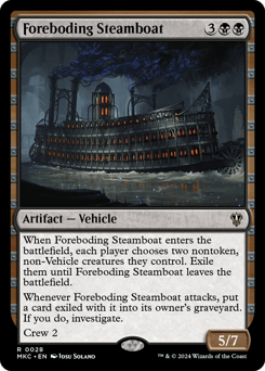 When this Vehicle enters, each player chooses two nontoken, non-Vehicle creatures they control. Exile them until this Vehicle leaves the battlefield. Whenever this Vehicle attacks, put a card exiled with it into its owner's graveyard. If you do, investigate. Crew 2
