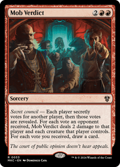 Secret council — Each player secretly votes for another player, then those votes are revealed. For each vote an opponent received, Mob Verdict deals 2 damage to that player and each creature that player controls. For each vote you received, draw a card.