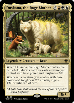 When Duskana enters, draw a card for each creature you control with base power and toughness 2/2. Whenever a creature you control with base power and toughness 2/2 attacks, it gets +3/+3 until end of turn.