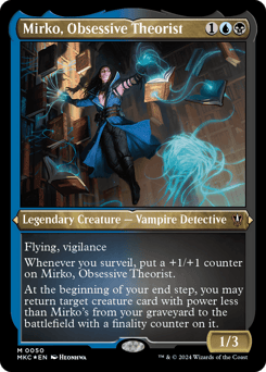 Flying, vigilance Whenever you surveil, put a +1/+1 counter on Mirko. At the beginning of your end step, you may return target creature card with power less than Mirko's from your graveyard to the battlefield with a finality counter on it. (If it would die, exile it instead.)