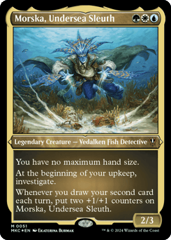 You have no maximum hand size. At the beginning of your upkeep, investigate. (Create a Clue token. It's an artifact with "{2}, Sacrifice this token: Draw a card.") Whenever you draw your second card each turn, put two +1/+1 counters on Morska.