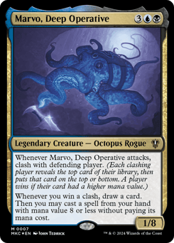 Whenever Marvo attacks, clash with defending player. (Each clashing player reveals the top card of their library, then puts that card on their choice of the top or bottom. A player wins if their card had a greater mana value.) Whenever you win a clash, draw a card. Then you may cast a spell from your hand with mana value 8 or less without paying its mana cost.