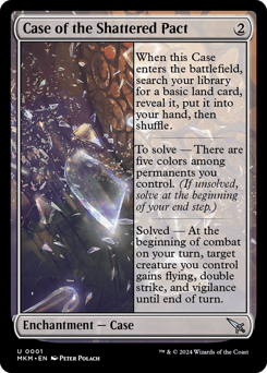 When this Case enters, search your library for a basic land card, reveal it, put it into your hand, then shuffle. To solve — There are five colors among permanents you control. (If unsolved, solve at the beginning of your end step.) Solved — At the beginning of combat on your turn, target creature you control gains flying, double strike, and vigilance until end of turn.