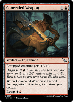 When this Equipment enters, cloak the top card of your library, then attach this Equipment to it. (To cloak a card, put it onto the battlefield face down as a 2/2 creature with ward {2}. Turn it face up any time for its mana cost if it's a creature card.) Equipped creature gets +1/+0 and can't be blocked. {1}{U}: Return this Equipment to its owner's hand.