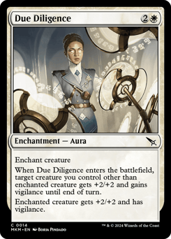 Enchant creature When this Aura enters, target creature you control other than enchanted creature gets +2/+2 and gains vigilance until end of turn. Enchanted creature gets +2/+2 and has vigilance.