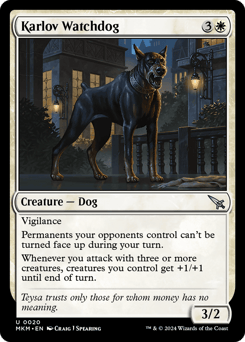 Menace When this creature enters, target opponent creates two 1/1 white Dog creature tokens. When this creature dies, each opponent loses 3 life. Disguise {1}{B}