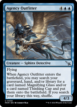 Flying When this creature enters, you may search your graveyard, hand and/or library for a card named Magnifying Glass and/or a card named Thinking Cap and put them onto the battlefield. If you search your library this way, shuffle.
