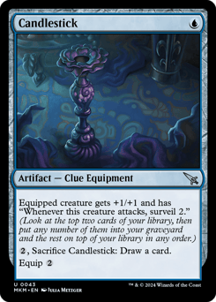 Equipped creature gets +1/+1 and has "Whenever this creature attacks, surveil 2." (Look at the top two cards of your library, then put any number of them into your graveyard and the rest on top of your library in any order.) {2}, Sacrifice this Equipment: Draw a card. Equip {2}