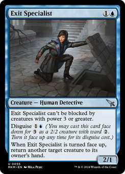 This creature can't be blocked by creatures with power 3 or greater. Disguise {1}{U} (You may cast this card face down for {3} as a 2/2 creature with ward {2}. Turn it face up any time for its disguise cost.) When this creature is turned face up, return another target creature to its owner's hand.