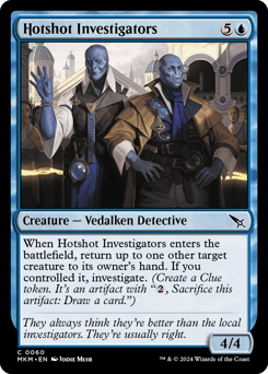 When this creature enters, return up to one other target creature to its owner's hand. If you controlled it, investigate. (Create a Clue token. It's an artifact with "{2}, Sacrifice this token: Draw a card.")