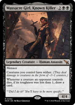Menace Creatures you control have wither. (They deal damage to creatures in the form of -1/-1 counters.) Whenever a creature an opponent controls dies, if its toughness was less than 1, draw a card.