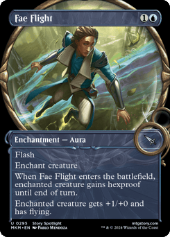 Flash Enchant creature When this Aura enters, enchanted creature gains hexproof until end of turn. Enchanted creature gets +1/+0 and has flying.