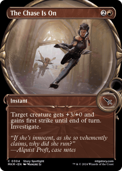 Target creature gets +3/+0 and gains first strike until end of turn. Investigate. (Create a Clue token. It's an artifact with "{2}, Sacrifice this token: Draw a card.")