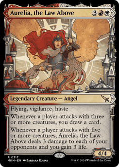Flying, vigilance, haste Whenever a player attacks with three or more creatures, you draw a card. Whenever a player attacks with five or more creatures, Aurelia deals 3 damage to each of your opponents and you gain 3 life.