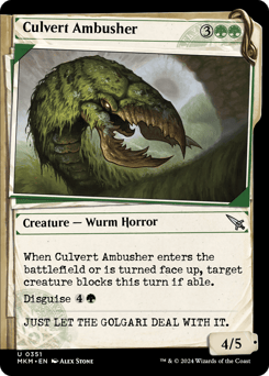 When this creature enters or is turned face up, target creature blocks this turn if able. Disguise {4}{G} (You may cast this card face down for {3} as a 2/2 creature with ward {2}. Turn it face up any time for its disguise cost.)