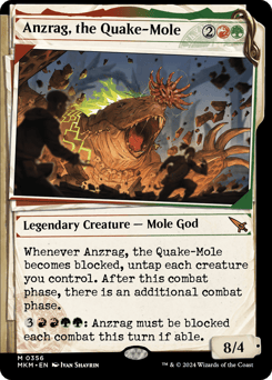 Whenever Anzrag becomes blocked, untap each creature you control. After this phase, there is an additional combat phase. {3}{R}{R}{G}{G}: Anzrag must be blocked each combat this turn if able.