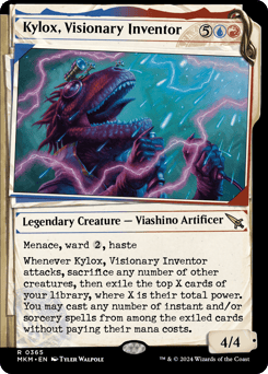 Menace, ward {2}, haste Whenever Kylox attacks, sacrifice any number of other creatures, then exile the top X cards of your library, where X is their total power. You may cast any number of instant and/or sorcery spells from among the exiled cards without paying their mana costs.