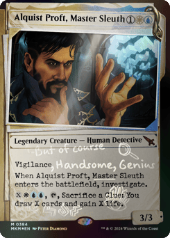 Vigilance When Alquist Proft enters, investigate. (Create a Clue token. It's an artifact with "{2}, Sacrifice this token: Draw a card.") {X}{W}{U}{U}, {T}, Sacrifice a Clue: You draw X cards and gain X life.