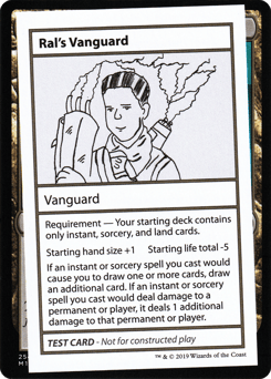 Requirement — Your starting deck contains only instant, sorcery, and land cards. Starting hand size +1 Starting life total -5 If an instant or sorcery spell you cast would cause you to draw one or more cards, draw an additional card. If an instant or sorcery spell you cast would deal damage to a permanent or player, it deals 1 additional damage to that permanent or player.