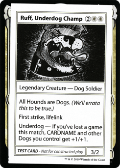 All Hounds are Dogs. (We'll errata this to be true.) First strike, lifelink Underdog — If you've lost a game this match, Ruff, Underdog Champ and other Dogs you control get +1/+1.