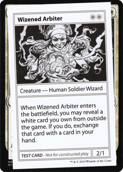When Wizened Arbiter enters, you may reveal a white card you own from outside the game. If you do, exchange that card with a card in your hand.
