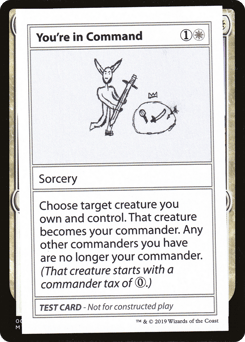 Choose target creature you own and control. That creature becomes your commander. Any other commanders you have are no longer your commander. (That creature starts with a commander tax of {0}.)